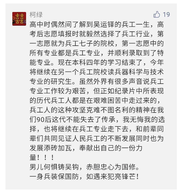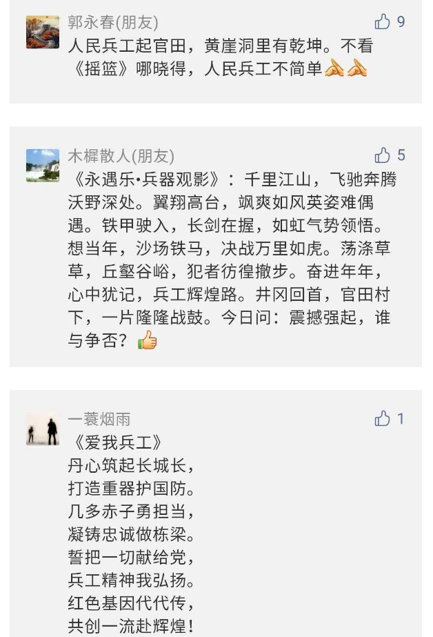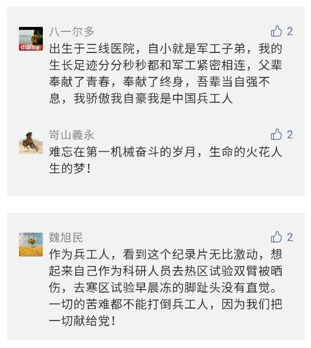 在中國共產(chǎn)黨成立九十九周年之際,由中國兵器工業(yè)集團有限公司組織攝制、反映人民兵工在黨的領(lǐng)導下80余年光輝奮斗歷程、廣大兵工人弘揚“把一切獻給黨”人民兵工精神的三集紀錄片《人民兵工》自7月1日-3日每晚20點在中央廣播電視總臺中文國際頻道(CCTV-4)《國家記憶》首播以來,在兵器系統(tǒng)和觀眾中引發(fā)強烈反響,很多網(wǎng)友、觀眾紛紛留言表達了自己的觀后感受。 觀眾在兵器工業(yè)集團官微的留言區(qū)直抒了觀影感受,有的熱淚盈眶,有的心潮起伏,有的興起賦詩,有的認為讓心靈得到凈化、思想得以提升,有的認為是最直觀的國防教育教材...... 影片勾起了退休老同志無限懷念、兵工人的甜美記憶、攝制期間官田中央兵工廠文化教育基地工作人員的難忘瞬間...... 相比老一輩,年a輕的兵工人也表達了傳承紅色基因,弘揚新時代“把一切獻給黨”的人民兵工精神的豪邁氣概...... 其中也不乏在校的學生,在感謝英模樹立的榜樣和豐碑的同時,也為自己的職業(yè)生涯定好坐標、做好規(guī)劃,努力前行...... 作為新時代弘揚人民兵工精神的特色文化成果,紀錄片的播出,凝聚起廣大兵器干部職工團結(jié)奮斗新時代磅礴力量,極大的增強了兵工人的自豪感,大家紛紛表達了作為軍工央企一員 “此生無悔入軍工”的使命擔當...... 《人民兵工》共分為三集,分別是《搖籃》《錘煉》《前行》,全景式展示了我們黨領(lǐng)導和創(chuàng)建的第一個軍事工業(yè)部門——人民兵工80余年來從無到有、從小到大、從弱到強的光輝奮斗歷程,生動講述了廣大兵工人聽黨話、跟黨走,大力弘揚“把一切獻給黨”的人民兵工精神,自力更生、艱苦奮斗、開拓進取、無私奉獻的家國情懷和感人事跡。在人民兵工80余年篳路藍縷的奮斗歷程中,涌現(xiàn)出吳運鐸、倪志福、祝榆生等一大批英模人物,在血與火的考驗中凝練形成了“把一切獻給黨”的人民兵工精神,成為人民兵工奮斗不息的紅色基因。(王珊) |