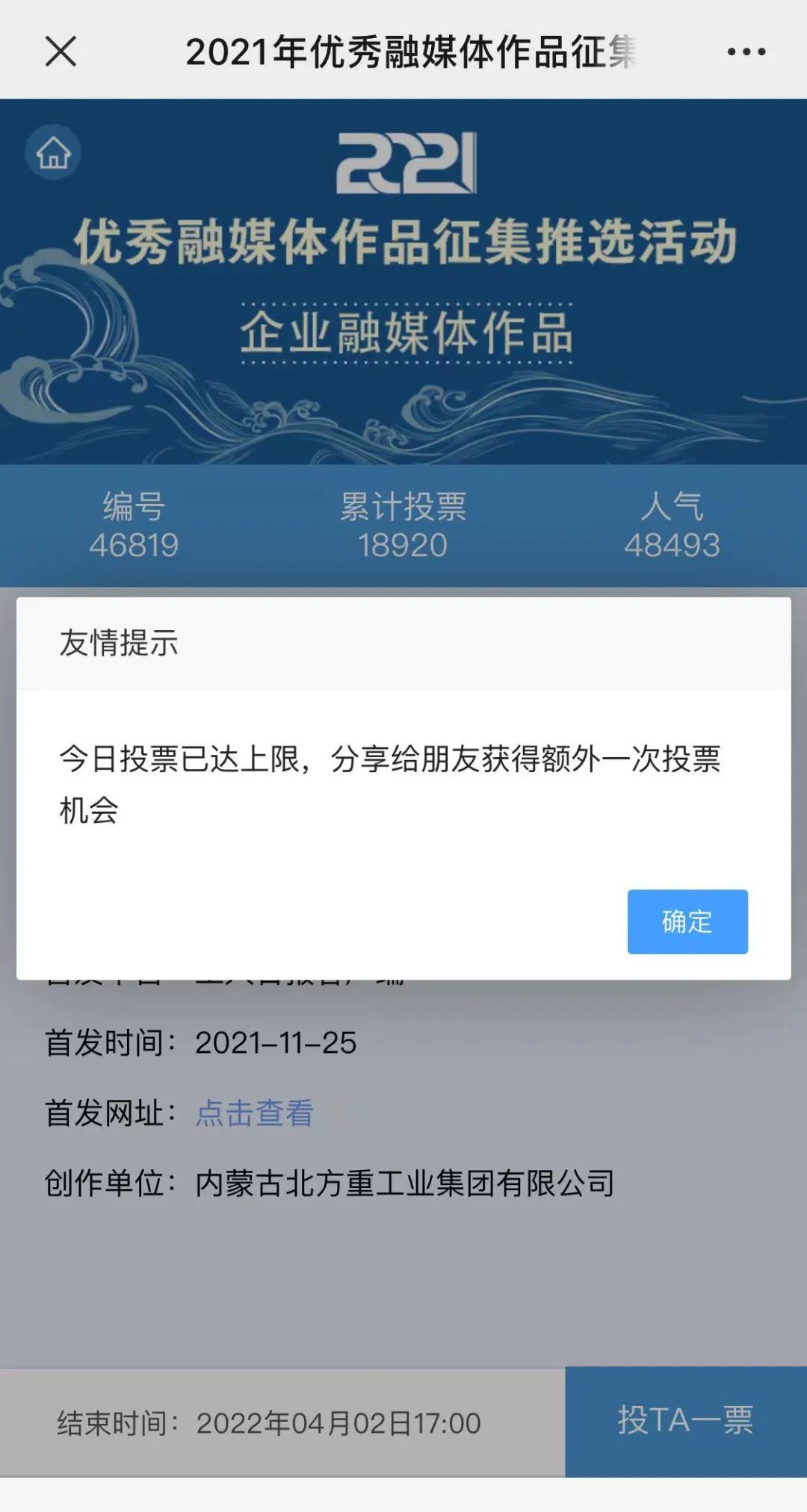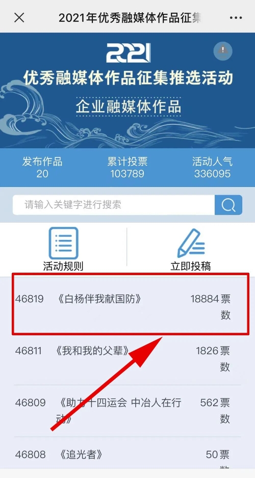 近日,由“文化強(qiáng)國”光明日報(bào)協(xié)同推廣平臺、光明網(wǎng)、北京師范大學(xué)新媒體傳播研究中心和光明天翼5G融媒實(shí)驗(yàn)室共同主辦的“2021年優(yōu)秀融媒體作品征集推選活動”開啟線上投票環(huán)節(jié),經(jīng)過專家委員會評審,中國兵器工業(yè)集團(tuán)北重集團(tuán)《白楊伴我獻(xiàn)國防》音樂MV入選活動前二十名,并進(jìn)入網(wǎng)絡(luò)投票環(huán)節(jié)。 《白楊伴我獻(xiàn)國防》 楊樹參天 高聳云端的是兵工人 “履行好強(qiáng)軍首責(zé)”的壯志凌云! 深植北疆 傾獻(xiàn)沃土的是北重人 “推動高質(zhì)量發(fā)展”的壯志豪情! 白楊樹伴著我們茁壯成長 見證著我們獻(xiàn)身國防! 投票方式 1.掃描下方二維碼,進(jìn)入初始界面,點(diǎn)擊“企業(yè)融媒體作品征集”,進(jìn)入投票界面點(diǎn)擊《白楊伴我獻(xiàn)國防》,點(diǎn)擊“投TA一票”; 2. 每人每日可投10票,直至提示投票達(dá)到上限即可; 3.投票時間:2022年3月17日09:00-2022年4月2日17:00。 來源/光明網(wǎng)、北重集團(tuán) |