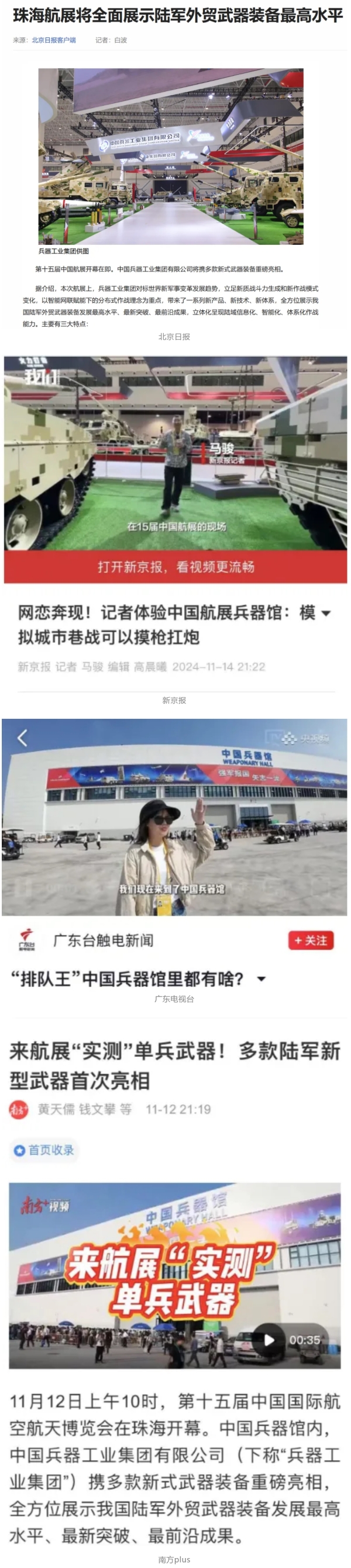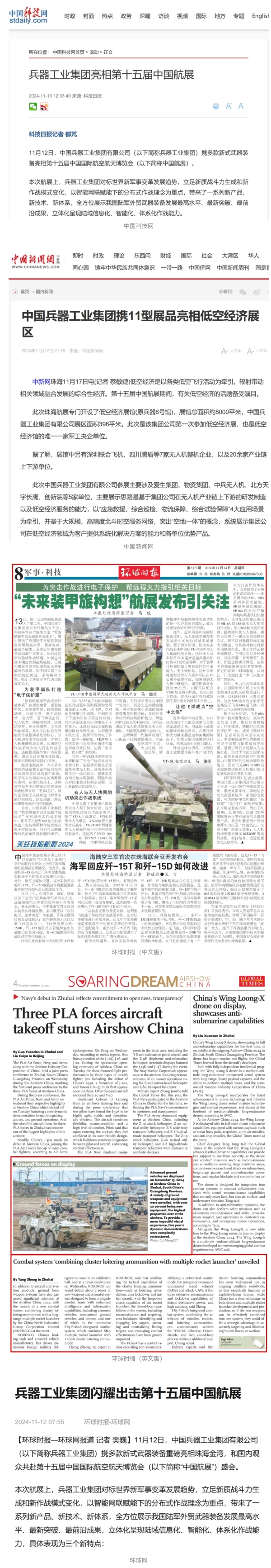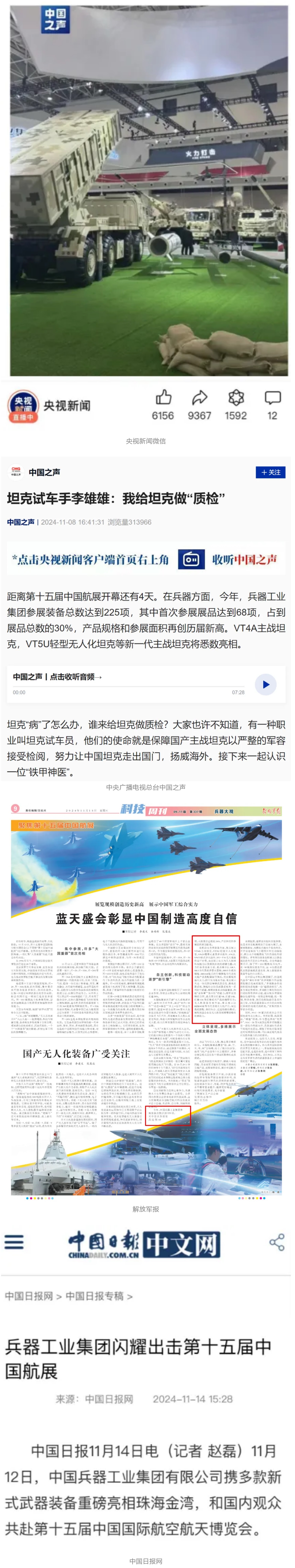 11月13日央視新聞《藍(lán)天之約》直播地面裝備動(dòng)態(tài)演示此次航展,央視綜合頻道《新聞聯(lián)播》《晚間新聞》、新聞?lì)l道《新聞直播間》《新聞30分》《朝聞天下》《共同關(guān)注》《東方時(shí)空》《午夜新聞》、財(cái)經(jīng)頻道《天下財(cái)經(jīng)》《經(jīng)濟(jì)信息聯(lián)播》《正點(diǎn)財(cái)經(jīng)》《第一時(shí)間》、中文國(guó)際頻道《今日環(huán)球》《中國(guó)新聞》、國(guó)防軍事頻道《軍事報(bào)道》《正午國(guó)防軍事》《國(guó)防軍事早報(bào)》《軍迷行天下》等欄目共播出兵器工業(yè)集團(tuán)參展相關(guān)新聞報(bào)道40余條。11月10日央視新聞?lì)l道《新聞30分》11月10日央視中文國(guó)際頻道《中國(guó)新聞》11月10日央視國(guó)防軍事頻道《軍事報(bào)道》11月11日央視國(guó)防軍事頻道《正午國(guó)防軍事》