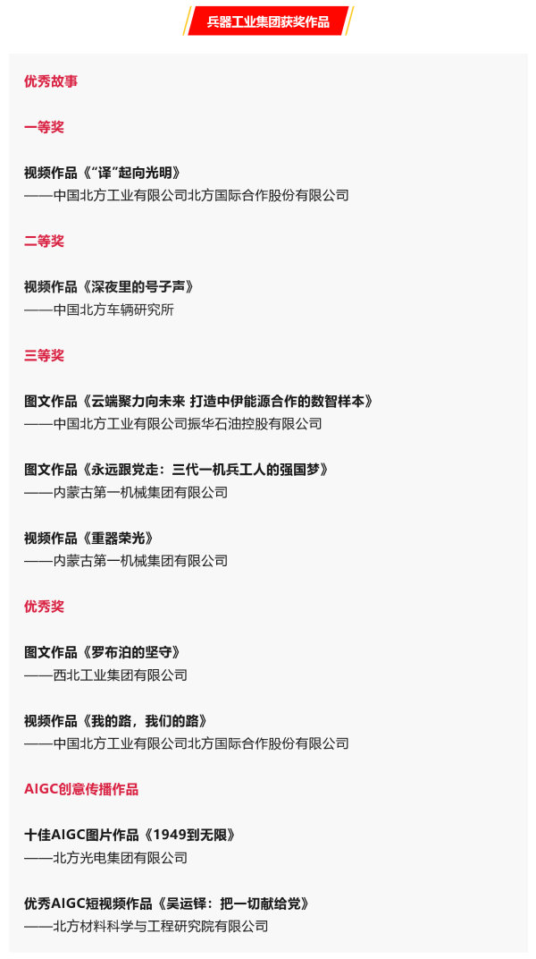 12月3日,由國(guó)務(wù)院國(guó)資委宣傳局、人民網(wǎng)聯(lián)合主辦的“砥礪七十五載 譜寫(xiě)央企擔(dān)當(dāng)”第七屆中央企業(yè)優(yōu)秀故事暨AIGC創(chuàng)意傳播作品發(fā)布展示活動(dòng)在京舉行,中國(guó)兵器工業(yè)集團(tuán)有限公司共有9件作品獲獎(jiǎng),其中,優(yōu)秀故事一等獎(jiǎng)1項(xiàng)、二等獎(jiǎng)1項(xiàng)、三等獎(jiǎng)3項(xiàng)、優(yōu)秀獎(jiǎng)2項(xiàng),十佳AIGC圖片作品1項(xiàng)、優(yōu)秀AIGC短視頻作品1項(xiàng)。