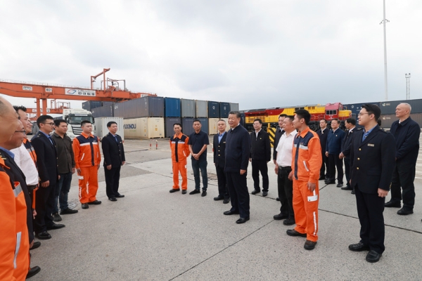 隨后,習(xí)近平來到重慶鐵路集裝箱中心站,聽取貨物集散、運輸路徑、運營成本和效益等介紹,同貨車司機、列車司機、裝卸工人、場站管理人員等親切交流,詢問他們的工作強度、勞動保護(hù)、節(jié)假日休息和收入情況。習(xí)近平說,大家在物流一線,也是在對外開放一線,通過你們的辛勤勞動,很多商品跨越山海、走向世界,你們的工作很有意義。推動西部大開放、促進(jìn)西部大開發(fā),物流很重要,大家要繼續(xù)努力,不斷創(chuàng)造新的業(yè)績,作出新的貢獻(xiàn)。
