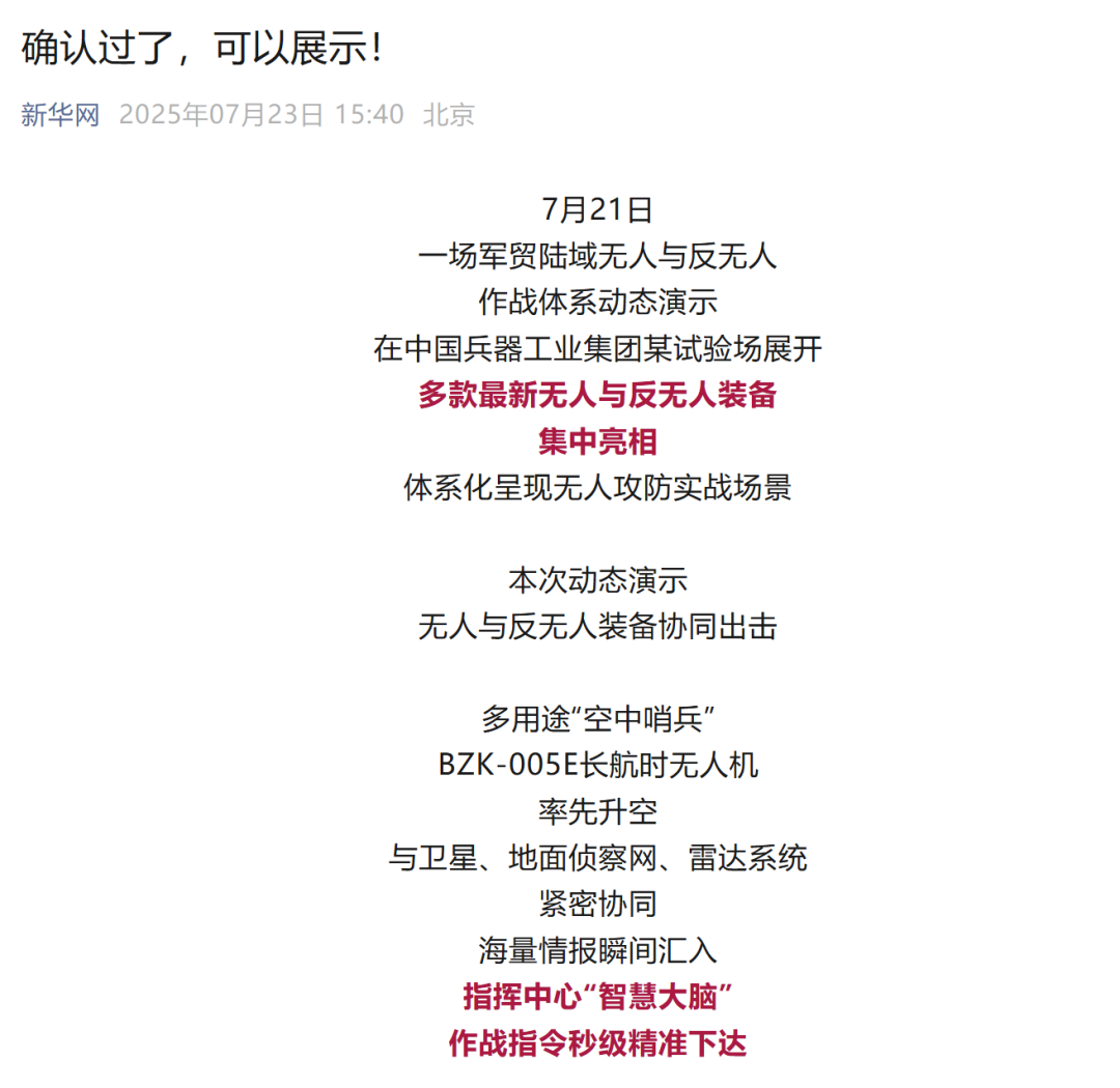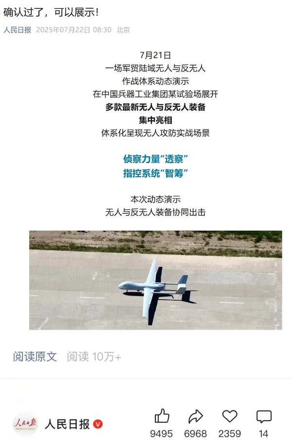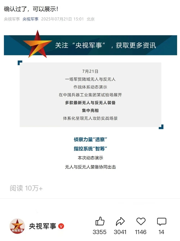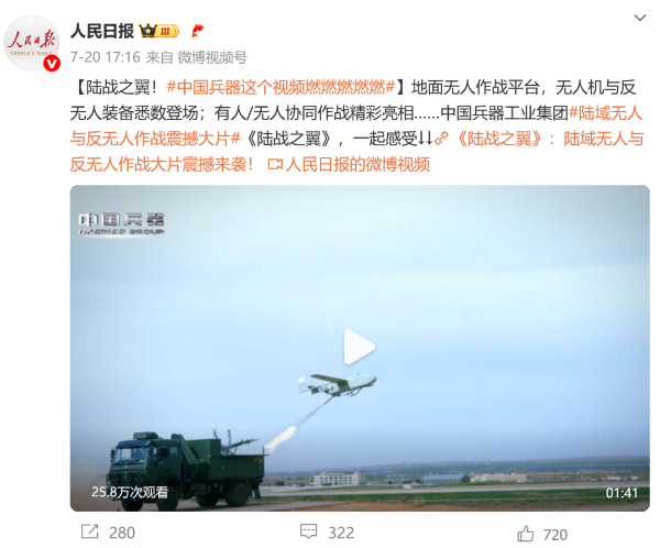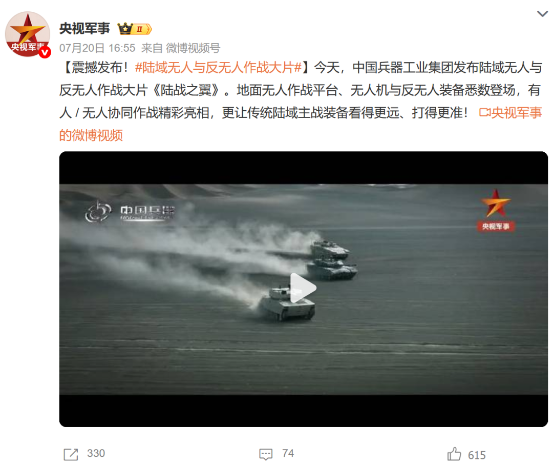 7月21日,中國兵器工業(yè)集團(tuán)有限公司在位于內(nèi)蒙古的某試驗(yàn)場(chǎng)舉辦軍貿(mào)陸域無人與反無人作戰(zhàn)體系主題日活動(dòng),攜無人機(jī)、巡飛彈、反無人機(jī)等最新武器裝備登場(chǎng)亮相,展現(xiàn)了一場(chǎng)無人與反無人領(lǐng)域激烈對(duì)抗的實(shí)戰(zhàn)場(chǎng)景。中央主流媒體、地方媒體、知名網(wǎng)絡(luò)媒體,以及集團(tuán)公司各宣傳平臺(tái)紛紛進(jìn)行報(bào)道,多次登上熱搜,引發(fā)廣泛關(guān)注。 央視新聞?lì)l道《新聞直播間》《東方時(shí)空》《24小時(shí)》、國防軍事頻道《正午國防軍事》《軍事報(bào)道》《國防軍事早報(bào)》、中文國際頻道《今日環(huán)球》、央視軍事新媒體等報(bào)道了集團(tuán)公司軍貿(mào)陸域無人與反無人作戰(zhàn)體系首次公開實(shí)裝動(dòng)態(tài)演示有關(guān)情況,重點(diǎn)介紹了無人與反無人作戰(zhàn)最新裝備。 央視新聞?lì)l道《新聞直播間》:內(nèi)蒙古 軍貿(mào)陸域無人與反無人作戰(zhàn)最新裝備亮相 央視新聞?lì)l道《新聞直播間》:內(nèi)蒙古 軍貿(mào)陸域無人與反無人作戰(zhàn)最新裝備亮相 記者探訪無人裝備展區(qū) 央視新聞?lì)l道《新聞直播間》:軍貿(mào)陸域無人與反無人作戰(zhàn)最新裝備亮相·記者探訪 最強(qiáng)“盾牌” 反無人機(jī)系統(tǒng)新升級(jí) 人民日?qǐng)?bào)微博、央視軍事微博、央視新聞客戶端、中國新聞網(wǎng)、中新社國是直通車抖音、環(huán)球網(wǎng)微博、環(huán)球時(shí)報(bào)(X平臺(tái)、英文版客戶端)、中國日?qǐng)?bào)網(wǎng)、央視軍事報(bào)道微博、中國軍號(hào)微博、中央廣播電視總臺(tái)“空天逐夢(mèng)”微信視頻號(hào)、共青團(tuán)中央B站、國資小新微博等中央主流媒體、國家部委的新媒體播發(fā)集團(tuán)公司陸域無人與反無人作戰(zhàn)大片等視頻作品。 人民日?qǐng)?bào)微博 央視軍事微博 人民日?qǐng)?bào)、新華網(wǎng)、央視軍事、央視新聞、中央廣播電視總臺(tái)中國之聲、中國新聞網(wǎng)、中國日?qǐng)?bào)網(wǎng)、中國日?qǐng)?bào)英文報(bào)刊《CHINA DAILY》、《科技日?qǐng)?bào)》、光明日?qǐng)?bào)客戶端、環(huán)球網(wǎng)、環(huán)球時(shí)報(bào)、人民日?qǐng)?bào)海外版-海外網(wǎng)、央視網(wǎng)、小央視頻、參考消息、瞭望東方周刊、共青團(tuán)中央、國資小新新媒體、新浪網(wǎng)、騰訊網(wǎng)、搜狐網(wǎng)、鳳凰網(wǎng)、網(wǎng)易網(wǎng)等中央主流媒體、國家部委的新媒體及知名網(wǎng)絡(luò)媒體對(duì)集團(tuán)公司軍貿(mào)陸域無人與反無人作戰(zhàn)體系主題日活動(dòng)進(jìn)行了圖文、音頻、視頻報(bào)道。 央視軍事微信 人民日?qǐng)?bào)微信 新華網(wǎng)微信 來源/各主流媒體 |